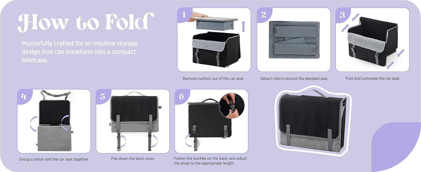 Easy Storage & Travel Ready- This dog car seat bed is easily foldable, adopting an intuitive storage design that transforms into a briefcase shape. This helpful feature saves storage space when setting the car seat aside. While features like the seat belt loop and adjustable head belt provides a quick to install car setup that’s perfect for on-the-go or for your next adventures.