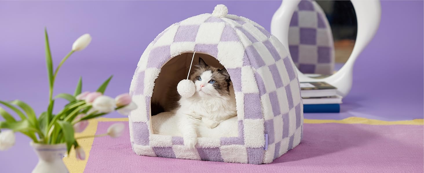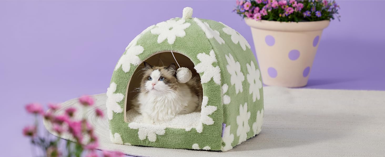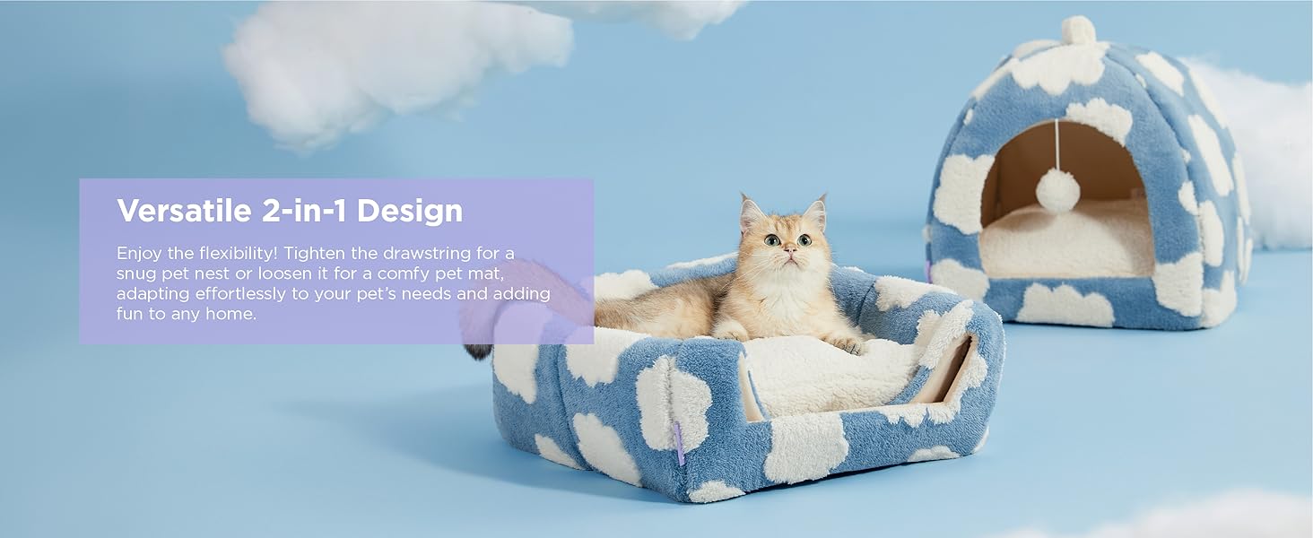 VERSATILE FEATURES- Set up this cat tent for a feline fortress of comfort or flatten it to transform it into a plush pet bed. A dangling toy ball at the entrance provides your feline with playful entertainment in their cozy retreat.