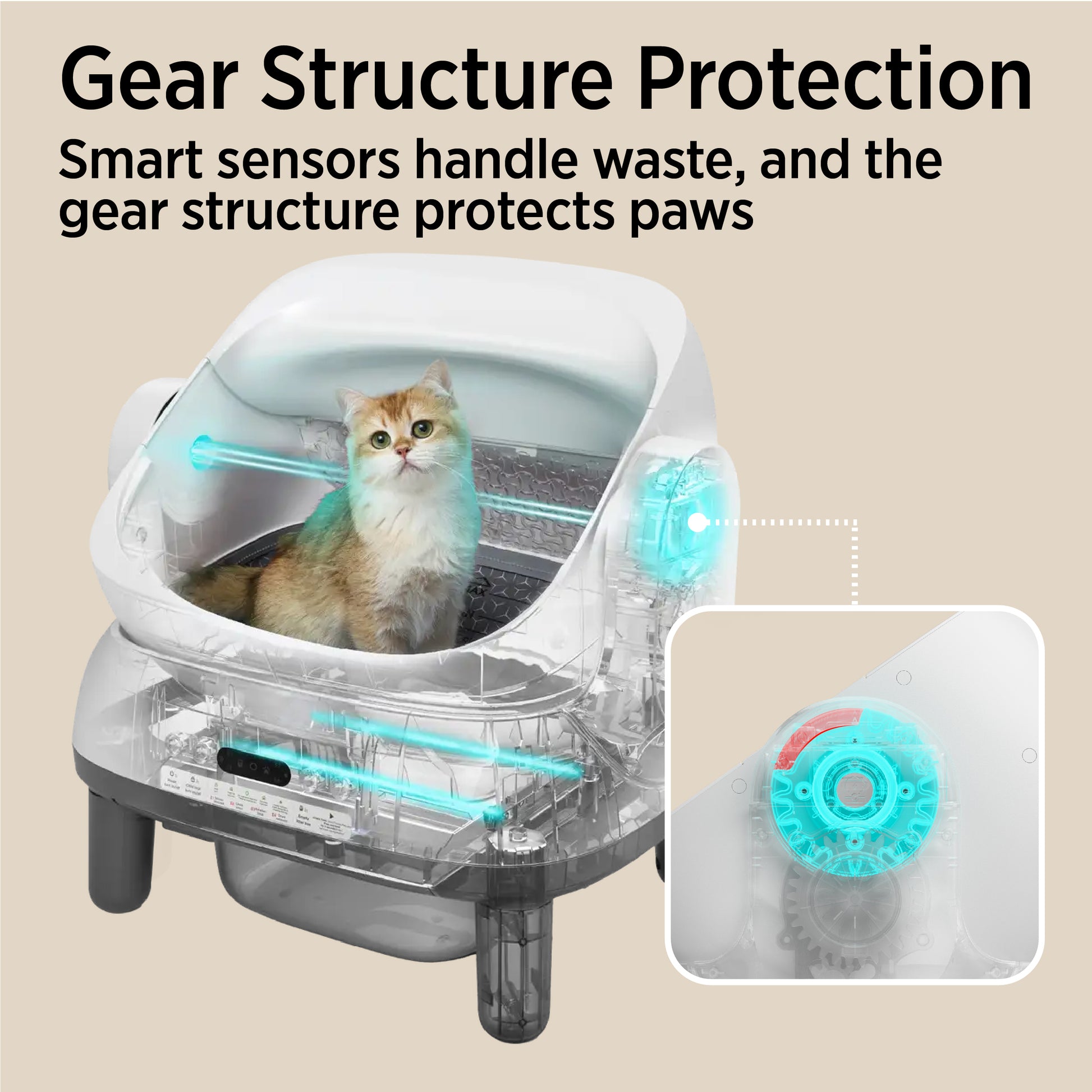 Spacious Open-Top Design for Security and Comfort - Safety and comfort go hand in hand. For active protection, built-in infrared sensors and an anti-pinch design continuously monitor for contact, automatically pausing operation if a cat is inside or touching the unit, ensuring complete peace of mind. The open-top layout meets your cat's instincts with clear visibility and multiple exit points, creating a more open space where cats feel safer and more in control, ideal for large breeds transitioning from traditional boxes.