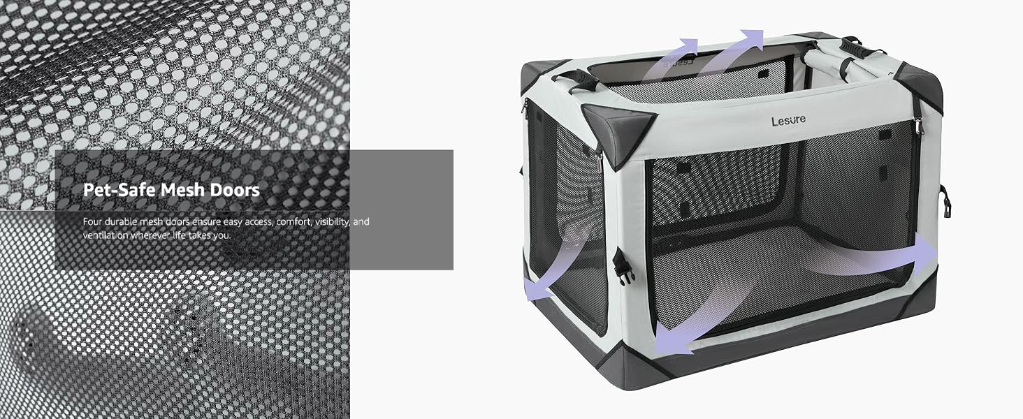 BREATHABLE AND DURABLE - With four zippered doors, this escape-proof crate allows multiple entry points. High-density mesh windows ensure durability, visibility, and ventilation. Mesh panels roll up for extra airflow.