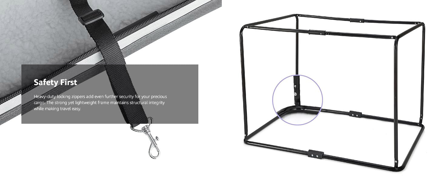 BUILT-IN SAFETY LEASH - An interior leash attachment secures your pet inside. Heavy-duty locking zippers on side doors enhance safety and security.