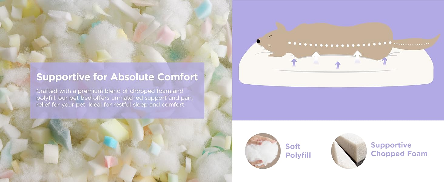 LUXURIOUS SUPPORT - Made with a 2:1 blend of chopped foam and polyfill, this bed offers optimal support and pain relief. The jacquard shaggy sherpa cover adds extra comfort.